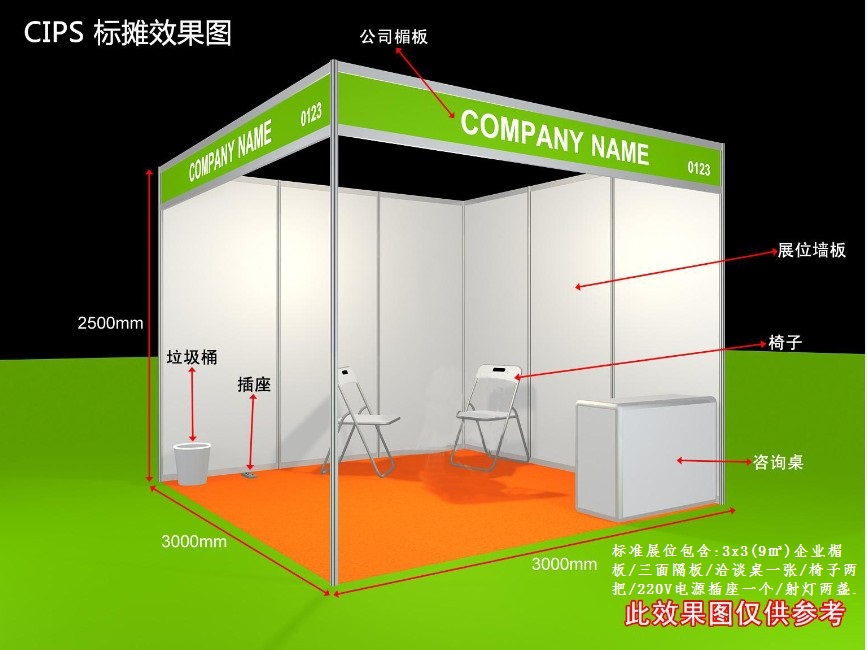 ■标准展位费用包括:展出场地、2.5m高壁板、楣牌制作、9平方米地毯、洽谈桌一张、椅子二把、10A/220V